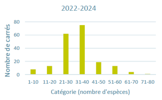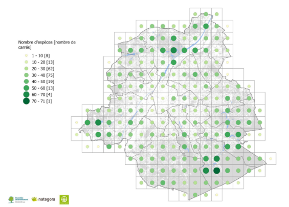 L’analyse spatiale des données révèle une distribution inégale de la richesse spécifique. Les carrés les plus diversifiés sont localisés en périphérie de la Région, dans des secteurs tels que la Forêt de Soignes, Neerpede et le Domaine Royal de Laeken, où les habitats semi-naturels restent relativement étendus et fonctionnels. En revanche, les zones à forte densité urbaine, en particulier au sein de la petite ceinture, présentent une diversité réduite. Ces résultats confirment l’importance des espaces verts et zones humides de qualité dans le maintien des populations d’oiseaux nicheurs en milieu urbain.